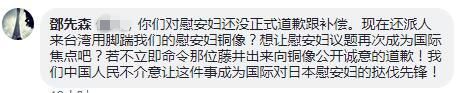 有網友留言向日本喊話:你們對慰安婦還沒正式道歉跟補償。中國人民不介意讓這件事成為國際對日本慰安婦的撻伐先鋒!