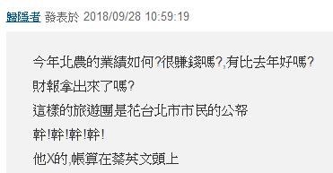 臺北市府官員表示,北農今年以來營利狀況呈現衰退,不過對于董事會的參訪行程卻比過去大手筆,12天的行程還可攜帶眷屬同行,全部由北農買單。