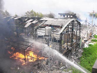 苗栗縣后龍鎮地下爆竹工廠爆炸,以鋼架及鐵皮搭建的廠房被夷為平地,消防人員以水柱撲滅余火。《聯合報》記者羅緗綸攝