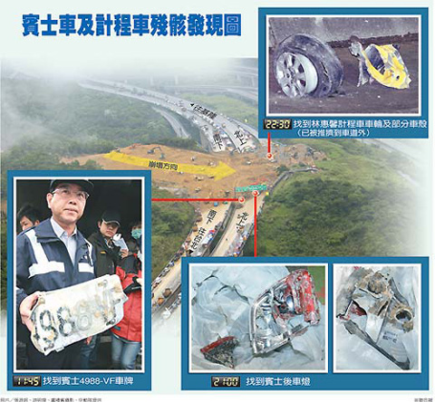 土石北端挖掘現(xiàn)場昨晚10時(shí)40分也有進(jìn)展,挖土機(jī)挖出車輪及出租車體及車燈碎片,分析也被嚴(yán)重?cái)D壓,而且發(fā)現(xiàn)地點(diǎn)在車道外,顯示土石崩塌的強(qiáng)大力量將車子推出車道。