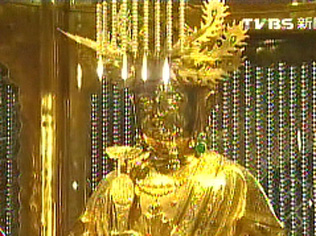 中國臺灣網9月17日消息 據臺灣TVBS電視臺報道,近日,隨著臺灣金價飆升,臺中縣鎮瀾宮的純金媽祖神像價值比7年前翻了近3倍已,達3億4000萬(新臺幣,下同)。鎮瀾宮方面擔心黃金媽祖被盜,做了多項防盜措施。