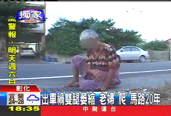 記者在彰化芳苑的大馬路邊,發(fā)現(xiàn)3、4只野狗圍著一個(gè)頭發(fā)斑白的老婆婆,她想閃躲,但似乎有困難,因?yàn)槔掀牌诺哪_嚴(yán)重萎縮,只能用爬的,而且一爬就是20多年。每天出門,老婆婆就在馬路上爬,旁邊車子一臺(tái)臺(tái)呼嘯而過(guò),記者看了都替她捏把冷汗。