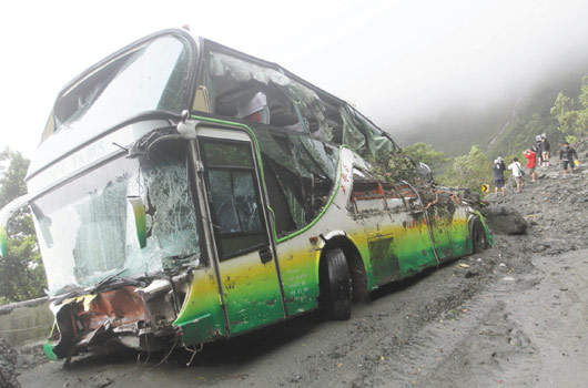 蘇花公路112.8公里處一輛被砂石擊中的游覽車(chē)23日被挖出后,車(chē)體支離破碎,顯示沖擊力道之大。來(lái)源:臺(tái)灣《聯(lián)合報(bào)》