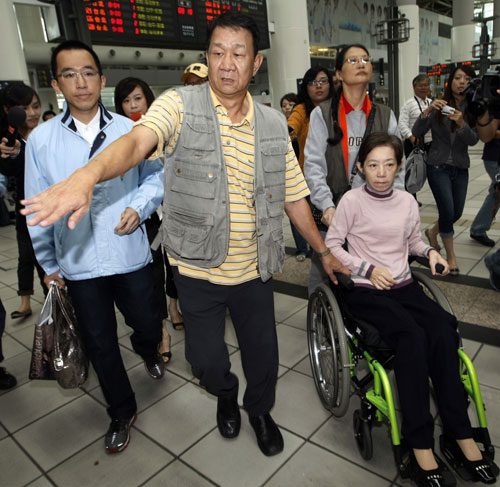 臺(tái)“最高法院”日前就龍?zhí)兜劝福嘘愃狻鞘缯?前右)夫婦有罪定讞后,吳淑珍與兒子陳致中(前左)15日搭島內(nèi)高鐵到臺(tái)北準(zhǔn)備探視陳水扁。 圖片來(lái)源:“中央社”