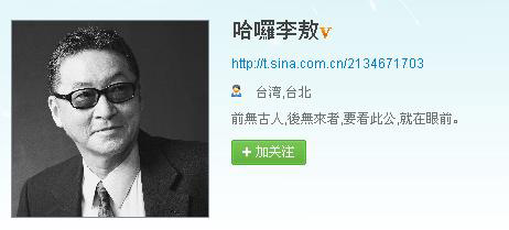 李敖17日在某大陸網站開設微博,引發不小的轟動。圖片截自李敖微博