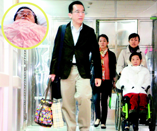 吳淑珍(前右)由媳婦黃睿靚(后右)、兒子陳致中(前左)、女兒陳幸妤(后左)陪同,到桃園醫院探視陳水扁(圓圖),一家人昨日在戒護病房團聚。(圖片來源:臺灣《聯合報》)