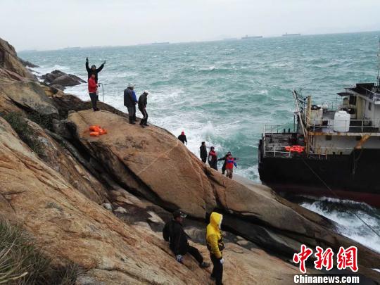 各搜救成員單位迅速趕往擔(dān)桿島石涌附近的岸邊,發(fā)現(xiàn)遇險臺灣船正擱在峭壁岸邊,船舶已經(jīng)下錨,被大風(fēng)吹著飄搖不定。救援人員拉著繩子下到陡峭的海邊,再用繩子拉住遇險船。船被固定在岸邊后,船上船員逐個下到岸上。