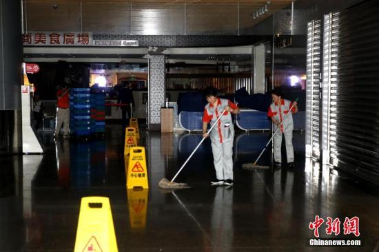 6月3日,臺灣桃園機場地下二層擺放著多個防滑提示牌,清潔工持續(xù)清洗地板。桃園機場及周邊2日遭遇強降雨,據(jù)機場地下二層商鋪老板介紹,水一度淹到倉庫內(nèi)約半米高。 中新社記者 陳小愿 攝