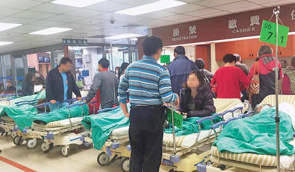 高雄長庚醫(yī)院急診室走廊,常躺滿求診病人。圖片來源:臺(tái)灣《中時(shí)電子報(bào)》
