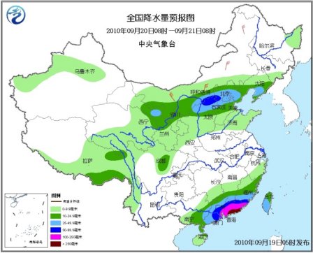 中新網9月19日電 據中央氣象臺消息,未來三天,全國降水范圍較大,其中,甘肅河西地區東部、內蒙古河套東部、陜西北部、山西北部、河北中北部、北京、天津北部、遼寧中南部、四川盆地西南部、湖北東部、湖南北部和南部、安徽中南部、江蘇西南部、浙江東南部、江西南部、福建東部和南部、臺灣、廣東、廣西大部有大雨或暴雨;臺灣大部、福建東南部、廣東大部、廣西東部等地有大暴雨或特大暴雨。上述地區局部并伴有短時雷雨大風或冰雹等強對流天氣。