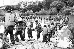 7月5日,湖北某預備役高炮師官兵在傳遞袋裝石料,用于管涌處置圍堰修筑。新華社發