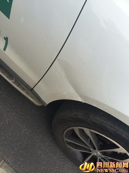 16日下午2時許,四川新聞網記者在紅星路南延線下穿商業大道隧道外的路旁,見到了唐先生和他駕駛的汽車。記者注意到,汽車右側車輪上方護殼處被砸進去了一條約2厘米深的凹槽,而在右側前車門的車窗上也有一道痕跡。唐先生稱,當時車上坐著5個人,如果當時坐在副駕駛的同事沒有關閉車窗,估計臉就開花了。