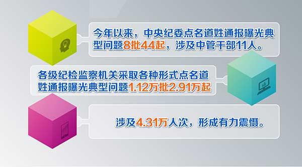 年初,中央紀委提出明確要求,對2016年1月1日以后發(fā)生的違反中央八項規(guī)定精神受到黨紀政紀處分人員,原則上都要點名道姓通報曝光。今年以來,中央紀委點名道姓通報曝光典型問題8批44起,涉及中管干部11人。各級紀檢監(jiān)察機關(guān)采取各種形式點名道姓通報曝光典型問題1.12萬批2.91萬起,涉及4.31萬人次,形成有力震懾。
