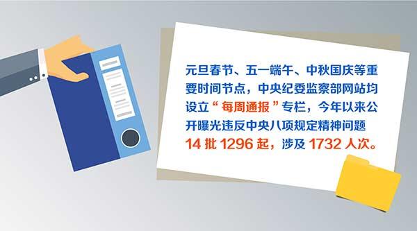 中央紀委堅持月報制度,每月定期公布《全國查處違反中央八項規(guī)定精神問題匯總表》。元旦春節(jié)、五一端午、中秋國慶等重要時間節(jié)點,中央紀委監(jiān)察部網(wǎng)站均設(shè)立“每周通報”專欄,今年以來公開曝光違反中央八項規(guī)定精神問題14批1296起,涉及1732人次。