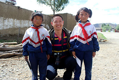 去日喀則偏遠(yuǎn)農(nóng)村探訪時(shí),趙方印(中)給孩子發(fā)放完愛心款后,跟孩子們一起合影。