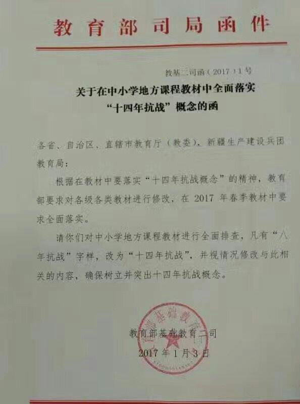 近日,教育部下發2017年1號函件《關于在中小學地方課程教材中全面落實“十四年抗戰”概念的函》(以下稱為《函件》)。1月10日,教育部基礎二司向澎湃新聞(www.thepaper.cn)證實了該通知確實由他們所發。目前2017年春季教材已全面落實。