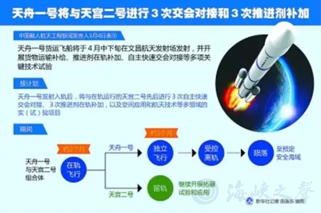 2017年4月中下旬,中國載人航天工程空間實驗室階段的收官之戰——天舟一號貨運飛船的發射任務即將展開。天舟一號貨運飛船將首試“太空加油”,開展貨物運輸補給、推進劑在軌補加、自主快速交會對接等多項關鍵技術試驗。這將標志著中國載人航天工程勝利完成“三步走”戰略中的“第二步”任務,為空間站建設任務奠定堅實技術基礎。