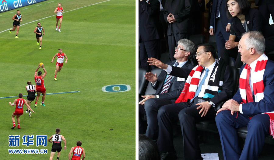 當地時間3月25日,國務院總理李克強在悉尼與澳大利亞總理特恩布爾共同觀看澳式足球比賽(拼版照片)。 新華社記者 龐興雷 攝