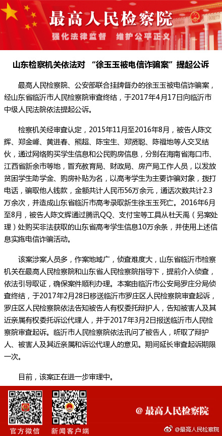 最高人民檢察院微信公號4月17日消息,最高人民檢察院、公安部聯合掛牌督辦的徐玉玉被電信詐騙案,經山東省臨沂市人民檢察院審查終結,于2017年4月17日向臨沂市中級人民法院依法提起公訴。