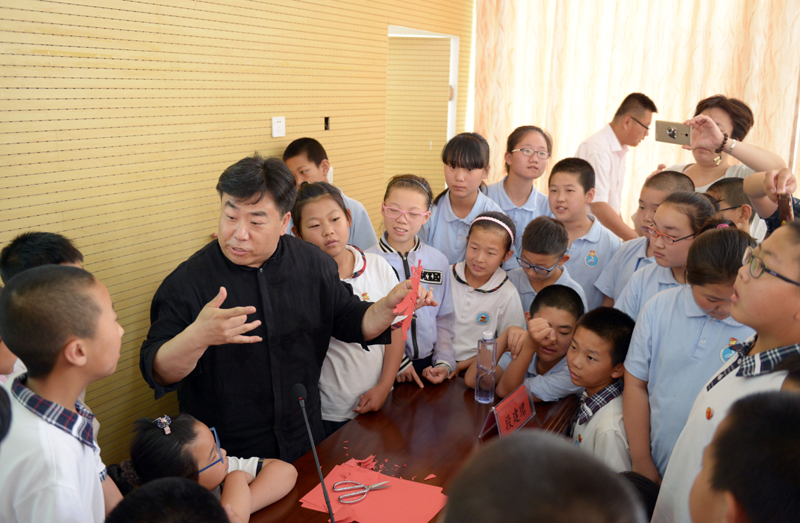 6月14日,呼和浩特市新城區光華小學活動室內,剪紙社團的同學們聆聽“中國十大神剪”之一的剪紙藝術家段建珺講述剪紙藝術。