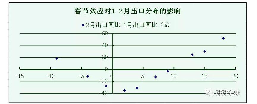 根據(jù)上表,得出春節(jié)效應對1-2月出口分布影響的分析圖如下: