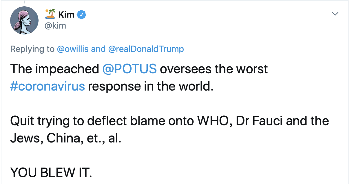網(wǎng)民:“別再把責(zé)任推給世衛(wèi)組織、福奇博士或中國了。是你把情況搞砸了。”↓↓↓
