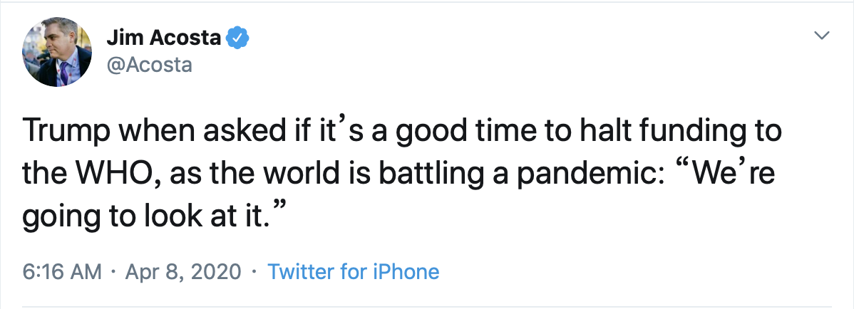 7日,特朗普在白宮疫情簡報會上批評世衛(wèi)組織“對危機(jī)反應(yīng)遲緩”,稱該組織“以中國為中心”,并威脅暫停向該組織繳納會費。8日,特朗普繼續(xù)指責(zé)世衛(wèi)組織,稱正在考慮取消對世衛(wèi)組織的資金支持。美國國務(wù)卿蓬佩奧也指責(zé)世衛(wèi)組織未盡責(zé)。9日,美國國務(wù)院發(fā)言人稱,世衛(wèi)組織“又一次將政治凌駕于公共衛(wèi)生之上”,美國對此深感不安。