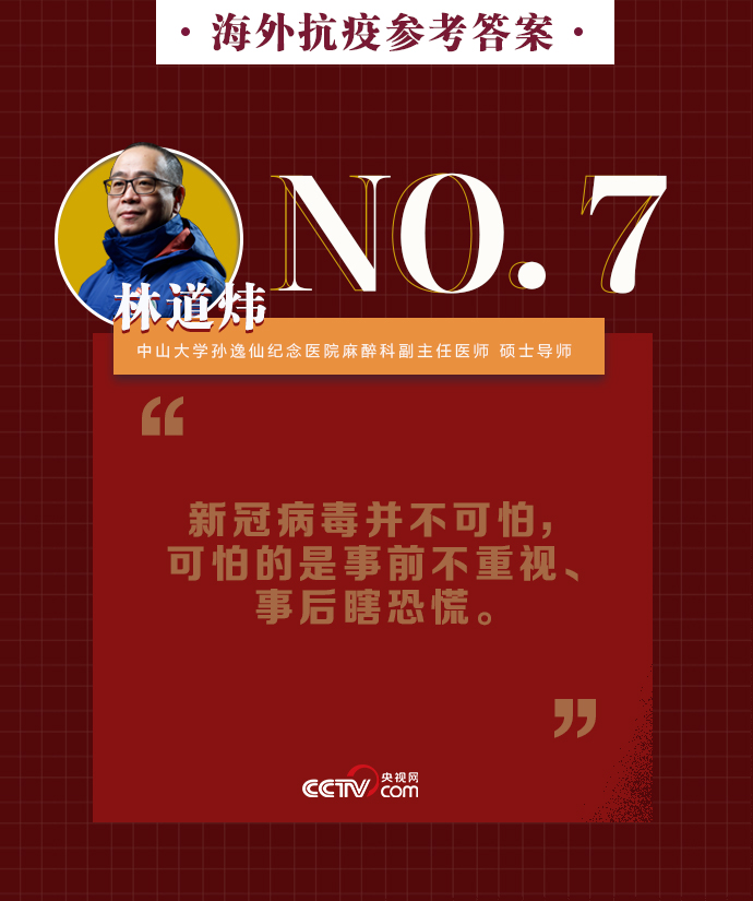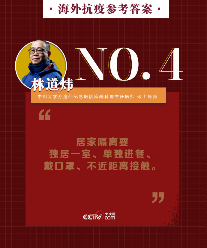 央視網消息:新冠肺炎疫情在全球持續暴發,海外同胞如何做好基本防護、保證自身安全?出現焦慮緊張的負面情緒該如何緩解?中山大學孫逸仙紀念醫院麻醉科副主任醫師、碩士導師林道煒送上硬核攻略:戴口罩、注意手衛生、減少與人接觸。做好這些,新冠病毒不可怕。