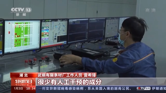 武鋼有限條材廠工作人員 雷希璋:這是我們的操控中心,就是從煉鋼到軋鋼,我們的智慧制造推進的情況,目前這個都是全自動控制的,很少有人工干預的成分。