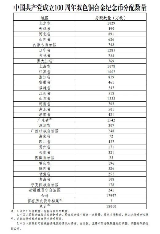 雙色銅合金紀念幣面額10元,直徑27毫米,材質(zhì)為雙色銅合金,發(fā)行數(shù)量1.8億枚(含留存歷史貨幣檔案3萬枚),各省、自治區(qū)、直轄市雙色銅合金紀念幣分配數(shù)量如下: