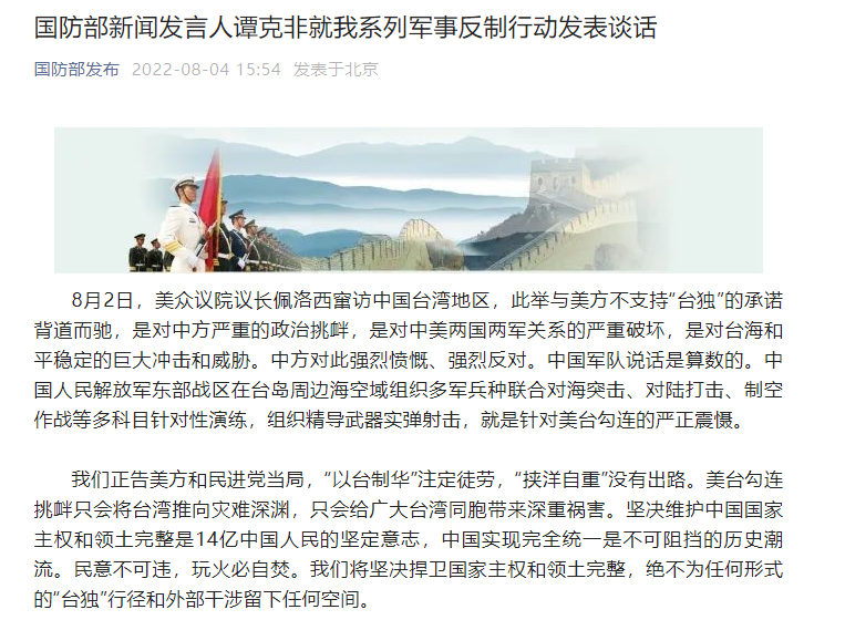 國(guó)防部新聞發(fā)言人譚克非就我系列軍事反制行動(dòng)發(fā)表談話,全文如下: