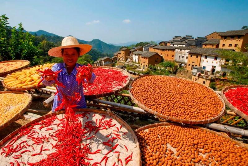 在安徽歙縣陽(yáng)產(chǎn)村的土樓群,村民們搶抓晴好天氣,晾曬農(nóng)作物——金黃的玉米、橘黃的南瓜、淡黃的核桃、火紅的辣椒……呈現(xiàn)出一幅幅色彩斑斕的“曬秋圖”。