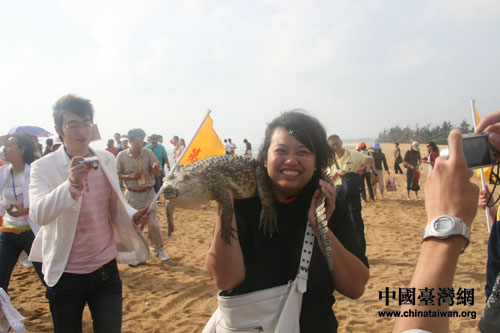 旖旎的玉帶灘沸騰了。營員們發揮著自己全部的創意,擺出各種造型拍照留念。為了獨特,一位綽號“蛋蛋”的臺灣女生,甚至不惜將鱷魚報在懷里,盤在肩上……