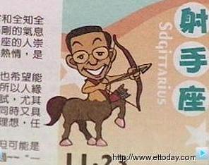 除了封面有意涵,這本農(nóng)民歷里的插圖更有趣。星座運勢里的射手座又被稱為人馬座,畫面中的人是謝長廷、底下踩著的是馬,是否有影射什么,讓人有很大的想像空間。