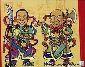 據(jù)臺東森新聞網(wǎng)報道,在謝長廷陣營推出的這版Q版農(nóng)民歷上,原本農(nóng)民歷上的門神變成了謝長廷與蘇貞昌兩人的卡通造型,寓意他們會為臺灣守住大門,下面一行“長”治久安更是意味深遠(yuǎn)。會有這樣的文宣構(gòu)想,原來是謝長廷之前下鄉(xiāng)拜拜時,求到一支“長治久安”的簽給他的靈感。