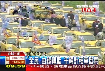 據(jù)臺灣“中央社”報道,臺灣“全民出租車”的凝聚力很強,過去歷次選舉都是堅決支持民進黨,但是這次臺灣地區(qū)領導人選舉支持對象“由綠轉(zhuǎn)藍”,受到外界關注。今天上午,在馬英九、蕭萬長后援會成立大會上,2500輛出租車排滿路面,臺“立法院長”王金平、臺北縣長周錫瑋及三重市長李干龍等人都到場致意。
