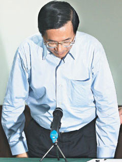 陳水扁卸任后首次舉行記者會,坦承短報選舉剩余款,這些錢由其妻吳淑珍在他不知情下匯往島外賬戶,他照著文字稿念完,隨即鞠躬離開,留下一堆謎團。臺灣《聯合報》圖