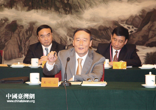 2008年臺(tái)商座談會(huì)28日上午在北京人民大會(huì)堂舉行。國(guó)務(wù)院副總理王岐山和國(guó)務(wù)院20多個(gè)主要部門負(fù)責(zé)人及60多位臺(tái)灣工商界人士、大陸臺(tái)商代表參加座談。圖為王岐山在座談上講話。(中國(guó)臺(tái)灣網(wǎng) 田云鵬 攝)