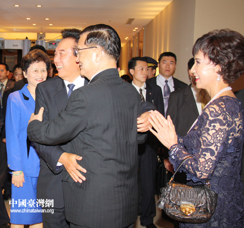 4日晚間,國(guó)民黨榮譽(yù)主席連戰(zhàn)在臺(tái)北國(guó)賓飯店宴請(qǐng)海協(xié)會(huì)會(huì)長(zhǎng)陳云林一行。這是連戰(zhàn)與夫人在宴會(huì)廳入口迎接陳云林與夫人,兩位老朋友在臺(tái)灣熱情相擁。(田云鵬 攝)