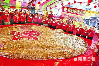 萬斤米糕桃。南投縣松柏嶺受天宮制作重1萬臺斤、號稱全臺最大的元宵超級米糕桃,昨舉行開香揭桃儀式。廟方表示,因玄天上帝腳踩龜、蛇,為了對龜神表示敬意,才將米糕龜改為米糕桃 。來源:臺灣《蘋果日報》