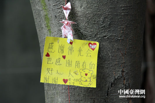 一走進彰明中學,兩岸記者就發現綠植上掛滿了各種卡片、千紙鶴等,仔細一看,發覺字里行間都是學生們親筆寫下的感謝與祝福。校長劉建雄告訴記者,這些都是學生們為表達對臺灣佛光會及對口援建省份河南等各地的愛心人士而精心制作,“5.12”地震1周年之際,學生們還將寫感謝信、感恩卡,在5月12日之前寄到臺灣國際佛光會總部,再表感謝。