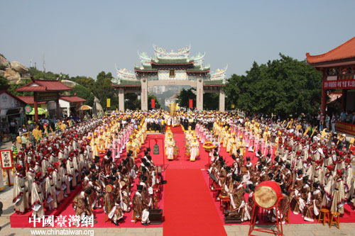 中華媽祖文化交流協會副會長兼秘書長、湄洲媽祖祖廟董事會董事長林金榜和臺灣十六個媽祖宮廟的代表作為主祭人,共同在媽祖娘娘面前,祈福風調雨順國泰民安,兩岸人民共享福祉。