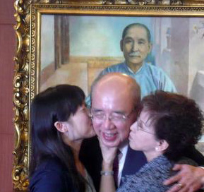 洪秀柱與江玲君一起向吳伯雄獻吻。(圖片來源:人民網)