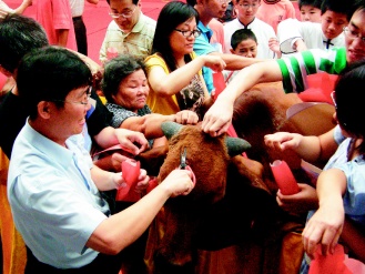 臺南縣祭孔最后拔智慧毛時,民眾一擁而上,有名30多歲男子竟掏出小剪刀在牛頭上連剪3、4次,將一撮撮牛毛放入口袋。有家長看見急著說:“智慧毛是要用拔的,孔夫子也不會認同用剪的。”另名家長說,如果不制止這種行為,以后他要將整條牛扛回家,也有人說明年帶電動刮胡刀來。(高大林)