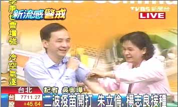 據(jù)臺(tái)灣TVBS電視臺(tái)報(bào)道,臺(tái)灣自制的甲型H1N1流感疫苗,今天開始第二輪施打,防疫總指揮朱立倫和“衛(wèi)生署長(zhǎng)”楊志良今天來到臺(tái)當(dāng)局“疾管局”接種疫苗。一個(gè)步驟一個(gè)步驟來,量測(cè)體溫、拿出健?,由一旁的護(hù)理人員來施打。楊志良還問了朱立倫,打這疫苗會(huì)不會(huì)痛啊?朱立倫說一點(diǎn)也不痛,希望臺(tái)灣人對(duì)自制疫苗有信心。