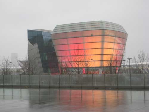 “全天域球幕劇場(chǎng)”是直徑12米的720度圓球形螢?zāi)唬驹谪灤┲虚g的天橋上觀(guān)看影像,12臺(tái)投影機(jī)分別由兩端投射上天下地的全球幕畫(huà)面,8聲道的音響系統(tǒng)環(huán)繞圓球,聲音來(lái)自四面八方。