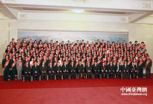 6月27日上午,對(duì)臺(tái)工作先進(jìn)集體、先進(jìn)個(gè)人表彰大會(huì)在北京人民大會(huì)堂舉行。圖為中共中央政治局常委、全國(guó)政協(xié)主席賈慶林會(huì)見對(duì)臺(tái)工作先進(jìn)集體和先進(jìn)個(gè)人代表并合影留念。 (中國(guó)臺(tái)灣網(wǎng) 田云鵬 攝)