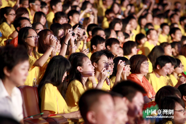 面對(duì)如此精彩的演出和眾多云集的明星大腕,青年們?nèi)滩蛔∧贸鲎约旱南鄼C(jī)拍照留念。(中國(guó)臺(tái)灣網(wǎng) 普燕 攝)