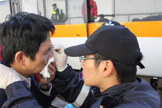 出事的太魯閣號列車的列車長(左)的頭部受傷,堅持留在現(xiàn)場未就醫(yī),桃園縣政府消防局救護員現(xiàn)場為他上藥。(圖片來自臺灣媒體)