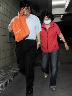林益世的母親沈若蘭(右)4日到案,訊后以200萬新臺幣交保,與律師步出臺檢方特偵組。圖片來自臺媒